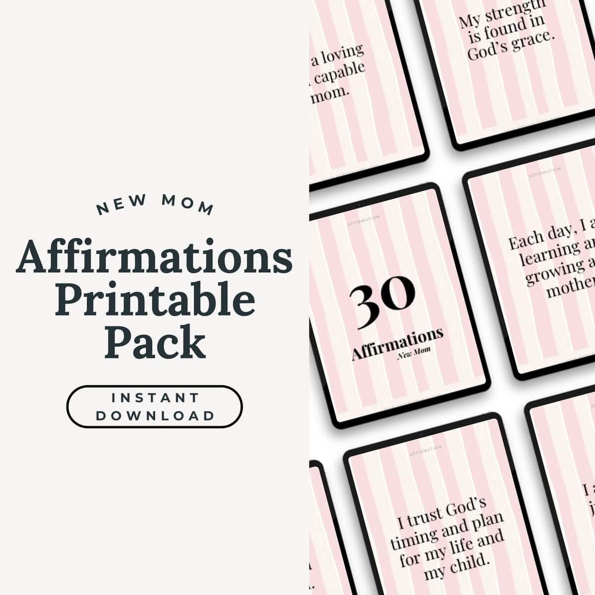 The New Mom Affirmations Printable Pack features 30 faith-based affirmations to encourage and inspire you during the early days of motherhood. Perfect for daily reflection, these uplifting reminders help you embrace Godโs grace, find strength, and thrive in your journey as a new mom. Download now and start your day with confidence and peace!